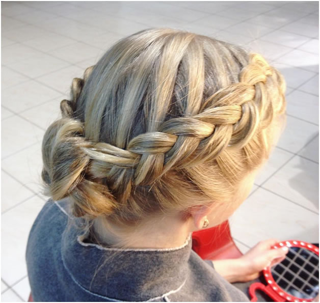 Для того чтобы плести такую причёску – нужно сбрызнуть волосы спреем. Далее по центру головы частично волосы разделяются ровным идущим по кругу пробором. Полученные волосы стоит собрать в хвост – приблизительно в него должно войти 50% процентов от волос. Желательно получить симметричный хвост. Затем чтобы резинка в причёске оставалась незамеченной, её стоит обернуть небольшой прядью волос. Плести стоит начинать с района уха. Так, сперва подхватывается тонкая прядка на голове и перекрещивается с прядью в хвосте. Пришло время добавить 3-ю прядь с головы и плести по кругу. При этом локоны должны собираться с каждой из сторон. Плетение должно завершаться возле второго уха. Та часть волос, которая останется, должна быть заплетена обычно и уложена. А для скрепления стоит использовать невидимки. С учётом того, на какое мероприятие предназначена данная укладка – она может быть туго заплетена либо слегка распушена. В том случае, если волосы очень длинные – корзинка может быть сформирована из двух кос. Для начала стоит хорошо расчесать волосы, потом сделать пробор по центру головы и поделить волосы поровну. Далее с каждой из сторон стоит отделять пряди. А оставшаяся часть волос должна быть собрана в пучок. И только потом стоит заплести те пряди, которые были отделены. Их нужно разместить вокруг головы и зафиксировать на пучке.